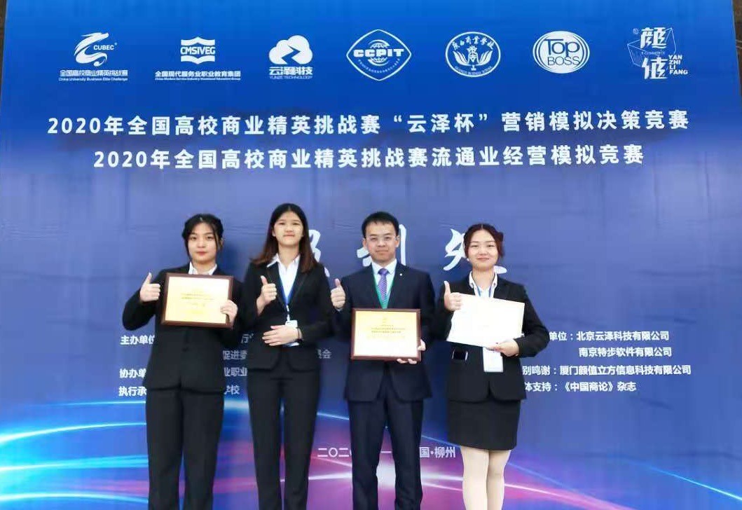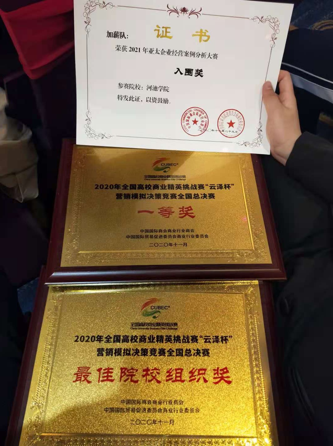 近日,2020年全国高校商业精英挑战赛“云泽杯”营销模拟决策竞赛全国精英赛落下帷幕。在公司大力支持和经管公司指导教师李冬哲的带领下,公司18级市场营销专业陈肖宇、陈丽、胡健娟组成的“加薪队”团队喜获全国一等奖、最佳院校组织奖及亚太企业经营案例分析大赛入围奖。