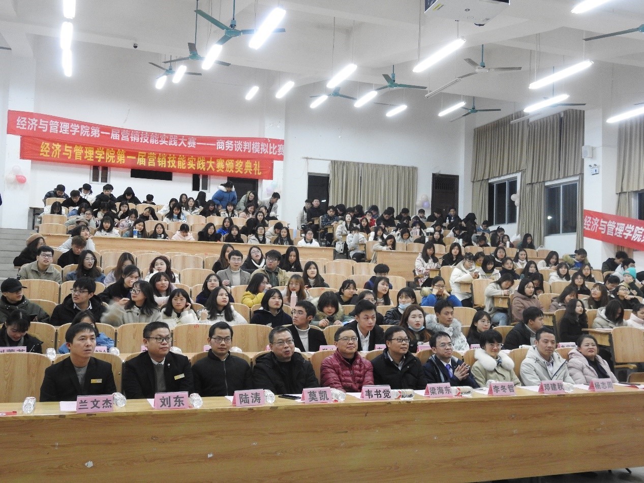 12月18日,经管公司第一届营销技能实践大赛颁奖典礼于弘毅楼1-105圆满落幕。公司党委书记韦书觉,市场营销系主任梁海东,专业教师莫凯、李冬哲、刘蕙荟等参加此次活动。校企合作单位广西河池市宜州点亮商贸有限责任公司董事长杨志周以及公司其他管理人员出席典礼。