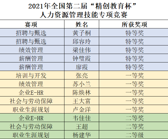 2021年1月21日-28日,全国第二届“精创教育杯”人力资源管理技能专项竞赛逐项开赛。在公司经管公司人力资源管理系主任刘智的指导带领下,由18级人力资源管理专业13名员工组成的代表队最终获得特等奖5名,一等奖5名,二等奖3名。