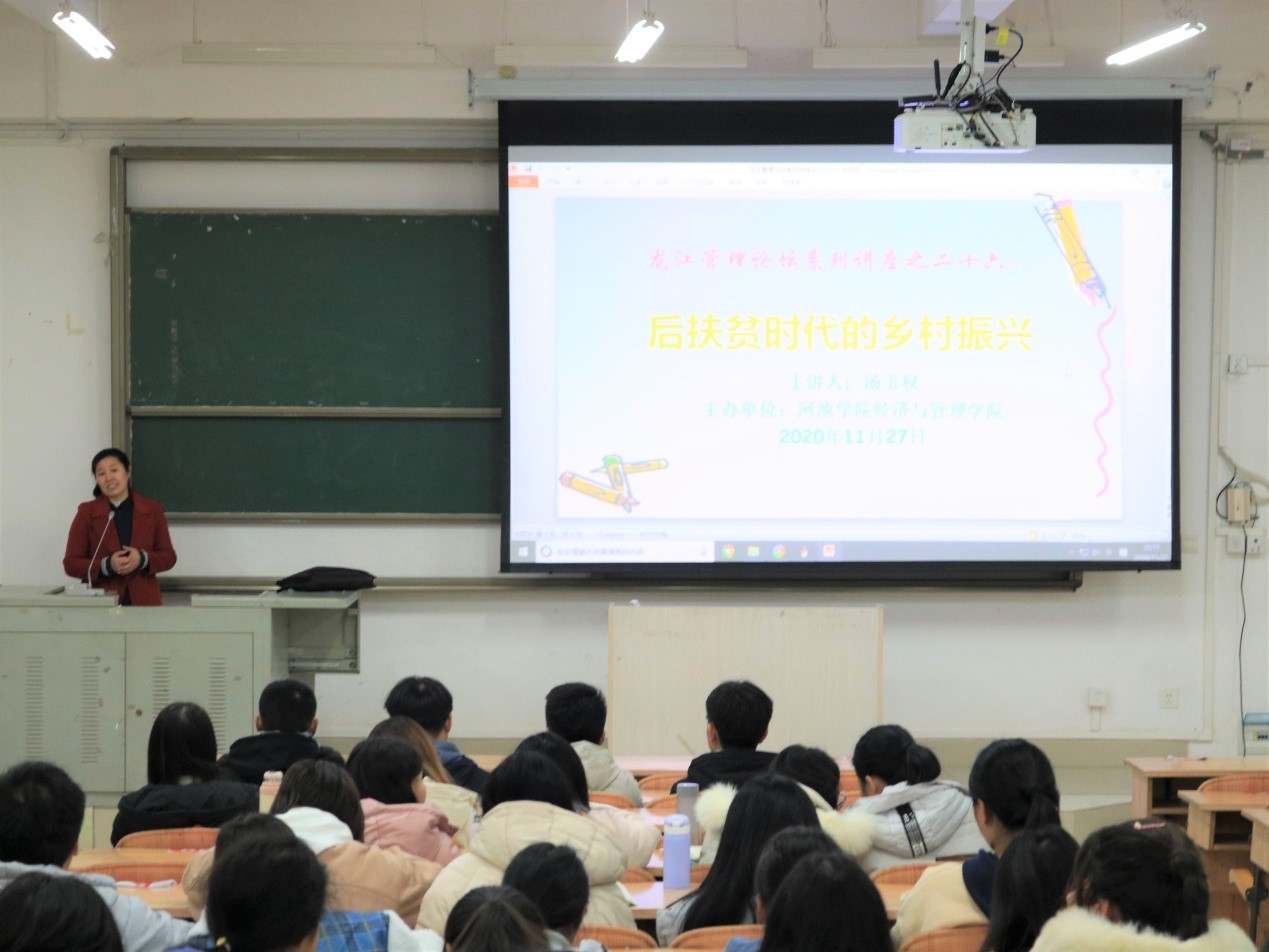 11月27日,经管公司于弘毅楼2-202举行第二十六期龙江管理论坛之“后扶贫时代的乡村振兴”专题讲座。本次讲座由广西大学公共管理公司教授、硕士生导师汤玉权主讲。公司部分专业老师及同学听取了此次讲座。