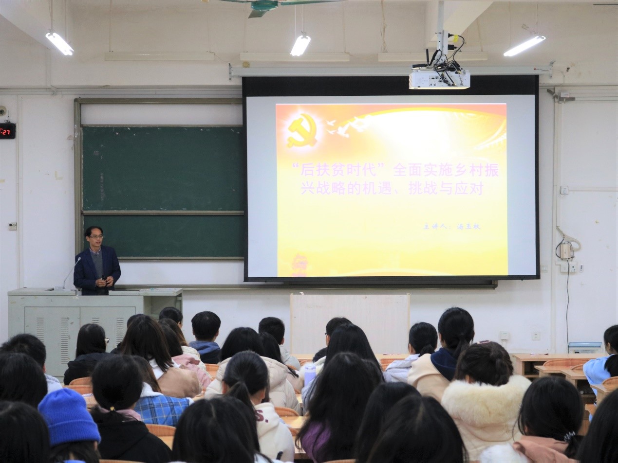 汤玉权教授用广泛的理论知识、丰富的实践案例、卓远的形势判断深刻阐述了脱贫攻坚与乡村振兴的内涵与关系,并对“后扶贫时代”全面实施乡村振兴战略的机遇、挑战与应对等内容进行详细讲述,全面总结了乡村振兴的成效与意义。同时呼吁同学们要积极参与脱贫攻坚,在实际行动中发挥好助力作用。