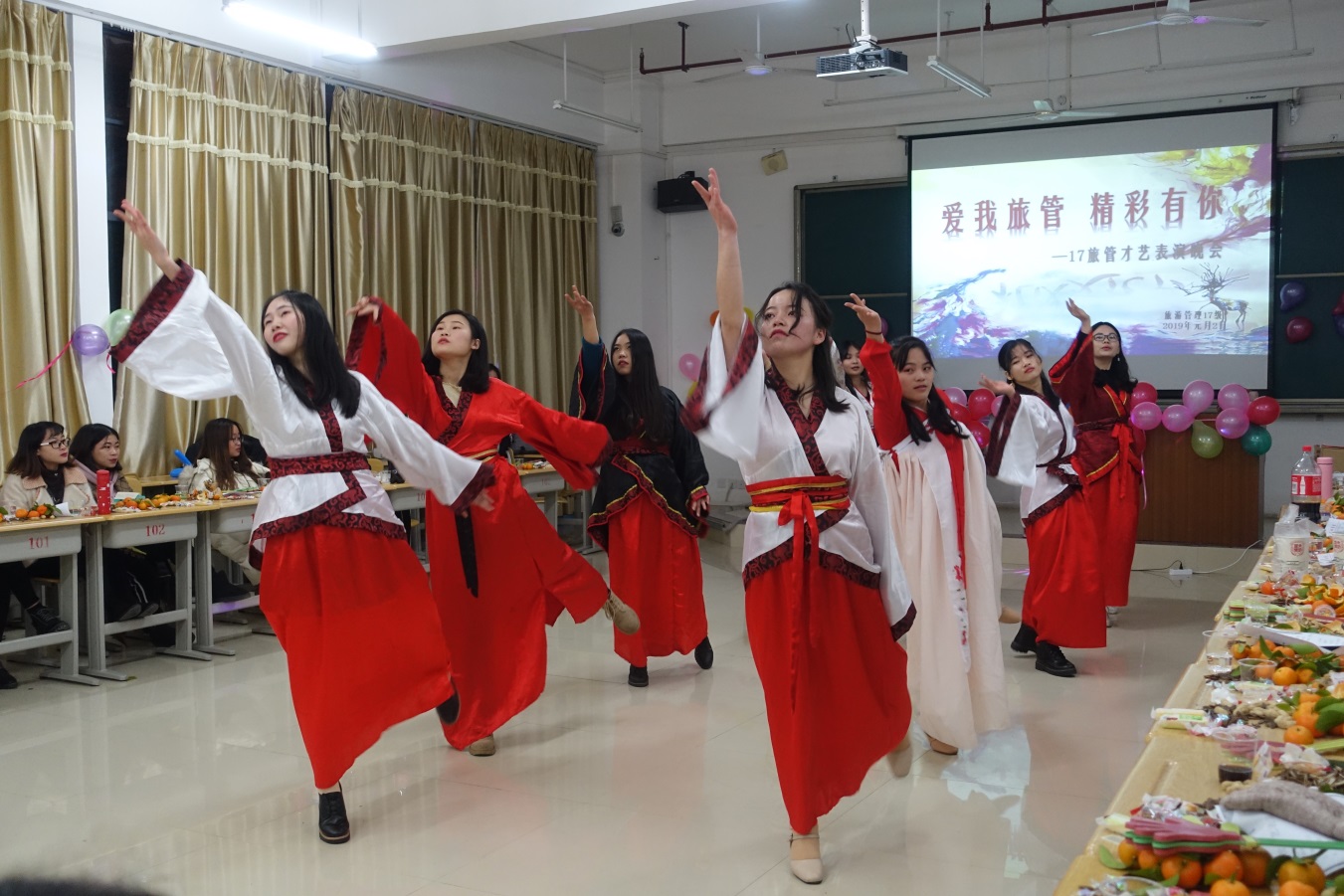为进一步推动班级文艺活动的蓬勃发展,提高班集体凝聚力,培养同学们的团队精神和增进同学们之间的友谊,丰富同学们的课余生活,放松学习压力,为同学们提供一个展现自我风采和勇气的舞台。2019年1月2日晚,17旅管在格致楼102成功举办了“爱我旅管精彩有你”主题迎新才艺表演晚会。公司党委书记韦书觉、副书记兼带班辅导员蓝色、公司分团委书记李云涛、辅导员黄挺龙、王忠文,旅游管理系苏慧慧老师等到场观看演出。余明朱、岳金焕担任晚会主持人。