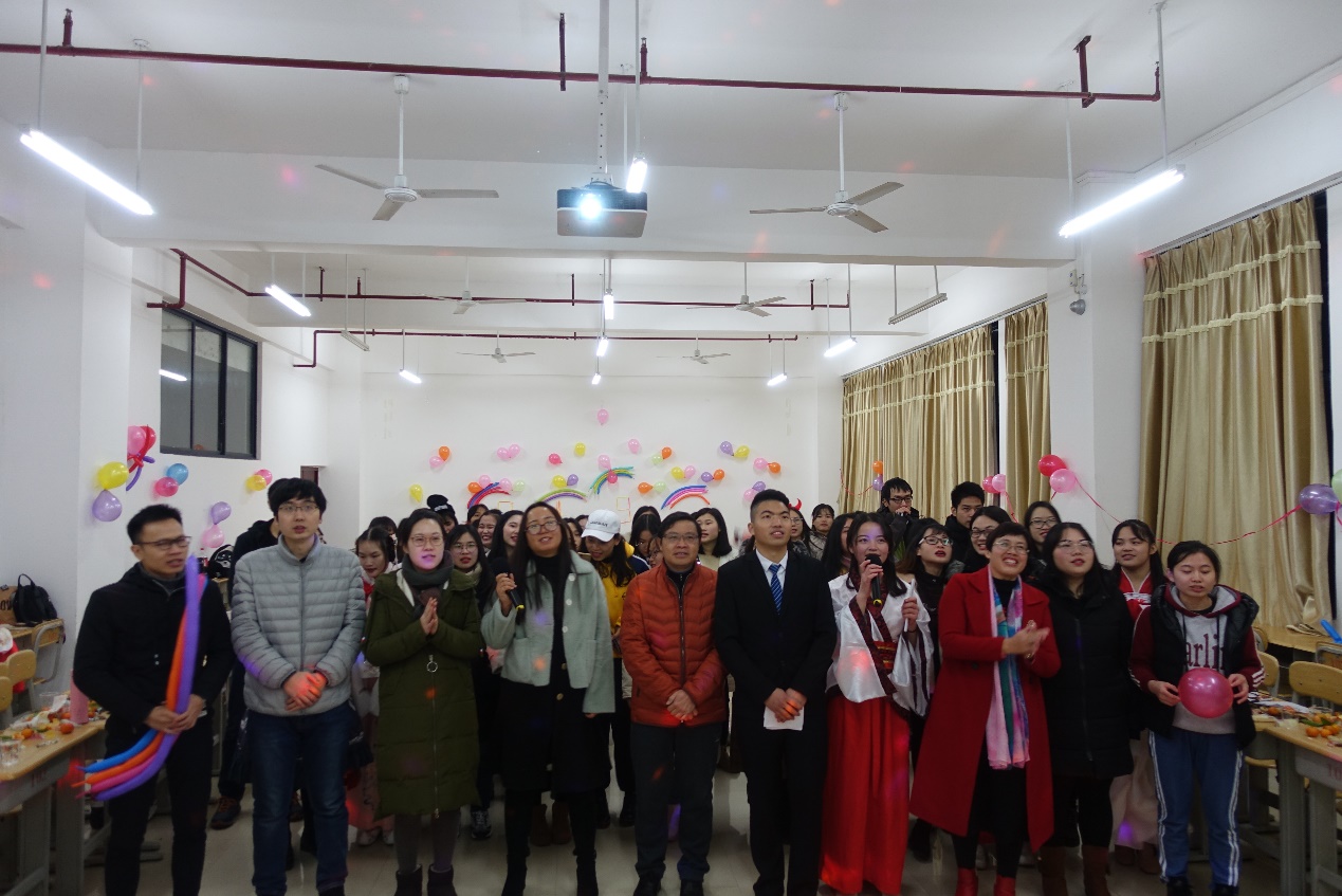 晚会现场布置喜庆温馨,晚会活动内容精彩纷程,在蓝色老师简短致词之后,才艺表演即刻上演。节目类型丰富多彩,有歌曲独唱与串烧,个人舞蹈与集体舞蹈,相声,手指琴,陶笛,非洲手鼓,尤克里里等乐器表演。在表演过程中,全场气氛热烈,同学们积极展示自己,晚会现场一片欢声笑语,掌声连连。现场观看的老师们也不甘落后,积极参与到演出队伍中来,黄挺龙老师的深情朗诵,蓝色、苏慧慧、王忠文等3位老师也一展歌喉,让同学们领略到课堂之外老师们的才情。在才艺展示的过程中穿插了有奖游戏环节,老师同学们都积极参与其中,乐此不疲。同时还播放精心制作的视频,视频记录同学们自进入大学以来成长趣事和值得纪念的瞬间,以及部分同学回望2018年的感悟和对2019的愿景录音。晚会最后在全体师生激情合唱《朋友》的嘹亮歌声中圆满落幕。