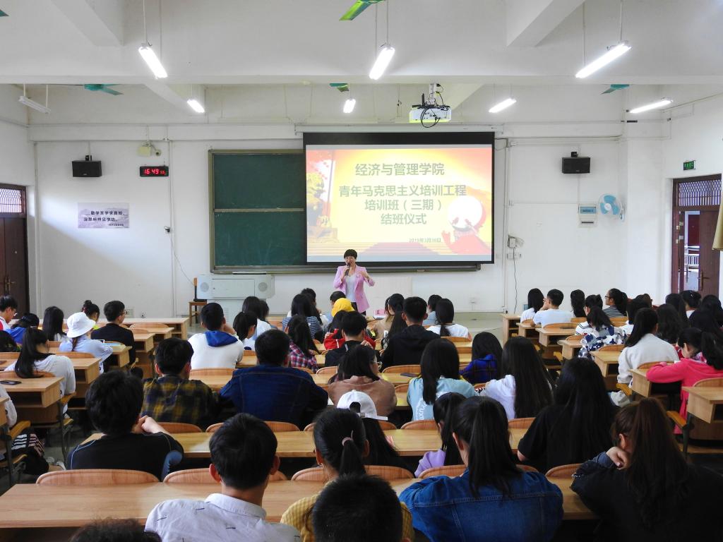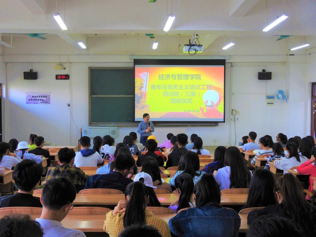 全体人员充满感情地演唱团歌后,大会正式开始。首先,由优秀学员代表孙钰洋上台发言,他对授课的老师们致以诚挚的感谢,同时,他表示今后将会以身作则,做好员工干部好榜样,认真学习马克思主义知识,将理论与实践结合起来。随后,黄挺龙老师上台发言,他勉励员工干部经过本次培训,要积极地把所学的马克思主义知识理论运用到实践中去,应用到班级服务中,为班级、公司发展做贡献。接下来,由韦书觉和蓝色老师分别为成绩优异的同学、顺利结业的同学颁发荣誉证书、结业证书。随后韦书觉老师通过请四个不同专业的同学两两组合,模拟订餐情景在以同学点评的方式,引出培训的意义,让大家更深入的了解某一方面的专题知识,引导大家系统的去学习马克思主义及其他专题知识。韦书觉老师指出大家要把所学理论知识运用到生活实践中,把生活中的每一件事做精做细。大会最后,蓝色老师对同学们展示出的礼仪风范提出了肯定并强调了“珍惜、感恩、健康、同行、成长”五个关键词,又提出了“实践、服务、奉献”三个关键词,循循善诱。最后,全体人员合影留念。