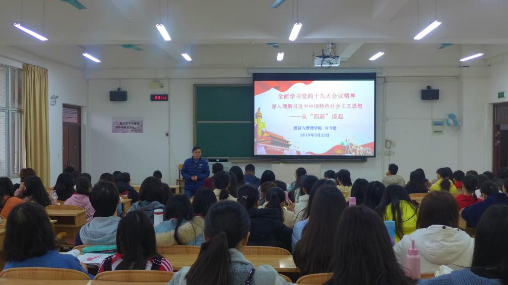 本次课程主题为“全面学习党的十九大会议精神,深入理解习近平新时代中国特色社会主义思想——从‘四新’谈起”。主要围绕不忘初心、牢记使命,高举中国特色社会主义伟大旗帜决胜全面建成小康社会展开此次授课。韦书觉在课堂上首先为大家讲述了十九大概况,让同学们对十九大有所了解,其次,从党的十八大以来的成就和“四新”——新时代、新思想、新使命、新征程两个大方面展开讲述。韦书觉将党的十九大精神与经典的例子和典型的视频相结合的教学形式,让同学们直观感受到党的十九大精神对个人、家庭、社会以及国家的重要性。最后,他希望同学们要正确看待我国取得的成绩,清醒地看到存在的问题——以科学、严谨、客观的态度,将十九大精神融入学习、工作与生活。