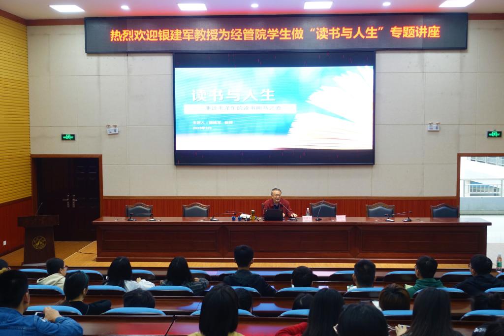 讲座中,银建军教授围绕读书人生的三个阶段、读书过程中的公司产品、读书和应用以及毛泽东的读书用书之道展开叙述。他首先通过经典楹联“几百年人家无非积善,等一等好事只是读书”引出“积善、读书是一辈子的事情”,随后又通过大数据展示各国人民的阅读现状,让同学们了解到读书的重要性,进而提出希望同学们养成会读书、好读书的好习惯。银建军教授在讲座过程中引经据典,穿透当今社会的事例,为同学们的读书作提供了导向和指点,给同学们的人生以启迪,使同学们获益匪浅。讲座结束后,台下观众的掌声经久不息。最后是互动环节,在场的同学们积极提问,银建军教授耐心为同学们解答疑惑。根据同学们的提问,银建军教授提出当代老员工除了看专业相关的书籍以外,也要多看一些文学作品,以此提高文化素养,培养情操。