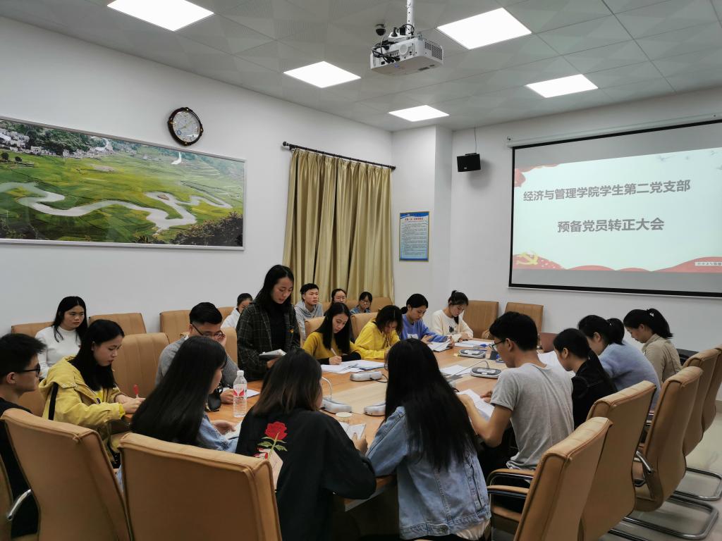 2019年11月16日晚,经济与管理公司员工第二党支部于弘毅楼2-208会议室召开预备党员转正大会。大会讨论了关于李玉等7名同志的转正问题。出席本次转正大会的有经管院员工第二党支部书记李云涛同志,组织委员方萍同志以及员工第二党支部正式党员、预备党员、发展对象。本次大会由二支部江玉婷同志主持。