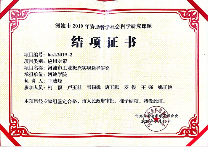 近日从河池市社会科学界联合会相关文件获悉,经济与管理公司莫凯老师主持的《河池市营商环境优化研究》荣获河池市2020年资助哲学社会科学研究课题立项(编号:hcsk2020-5),资助经费3万元,该课题旨对河池市营商环境进行全面深度调研、问题剖析及后期优化等相关研究,为市委市政府及相关部门提供决策参考。此外,公司王威峰老师主持的河池市2019年资助哲学社会科学研究课题《河池市工业振兴实现途径研究》(编号:hcsk2019-2)顺利结题,资助经费3万元,该课题基于直接调研和间接搜集相结合、定性分析与定量分析相结合、横向对比与纵向对比相结合、宏观中观与微观分析相结合、数理模型与计量模型相结合等方法深入分析了近十年河池市工业发展乏力的主要表现、主要原因,在此基础上从迎合国家发展战略和地区经济发展契机重塑地区比较优势,从激发市场(企业)主体活力、乘区域协调发展东风和做好政策保障等方面阐述推动河池工业振兴的实现途径。