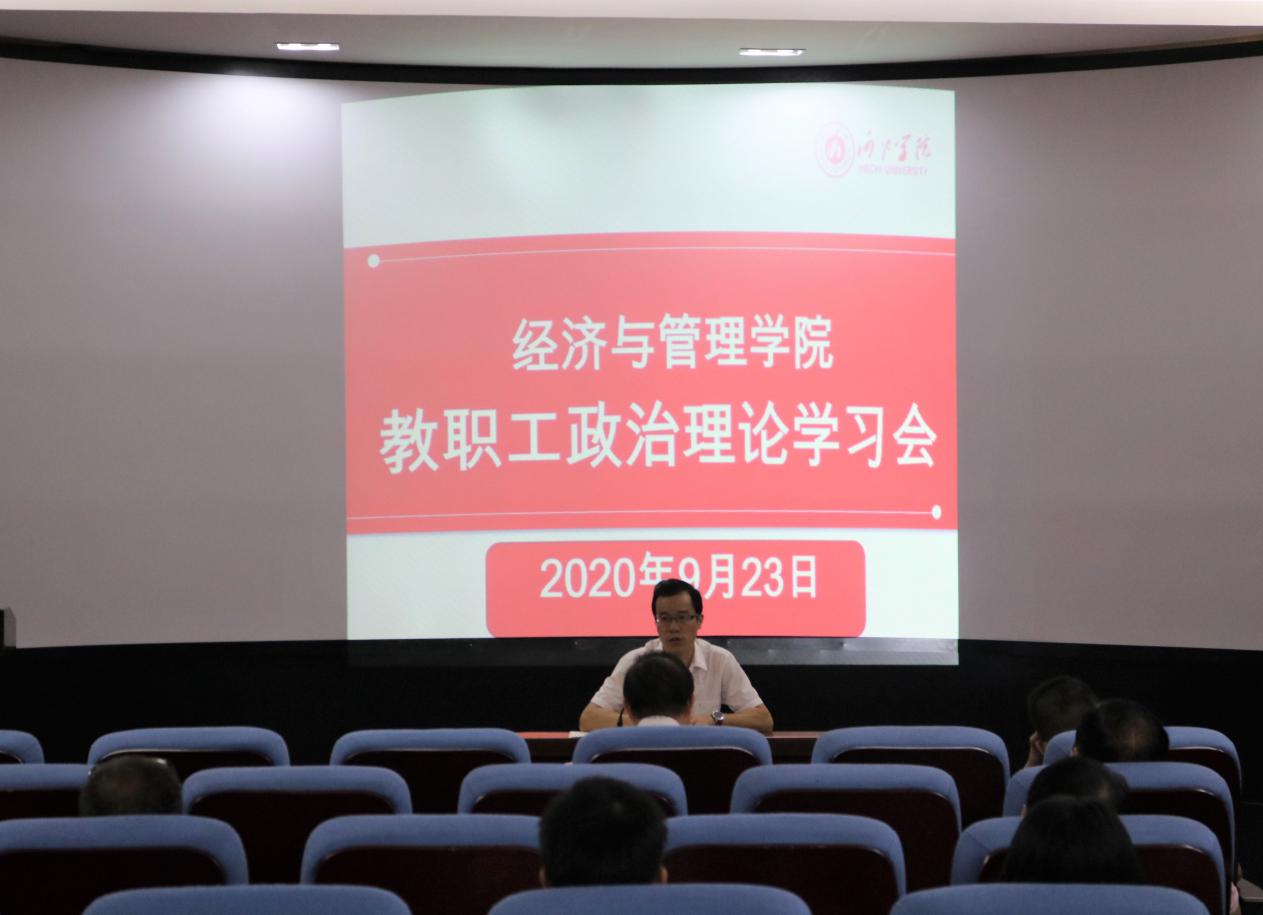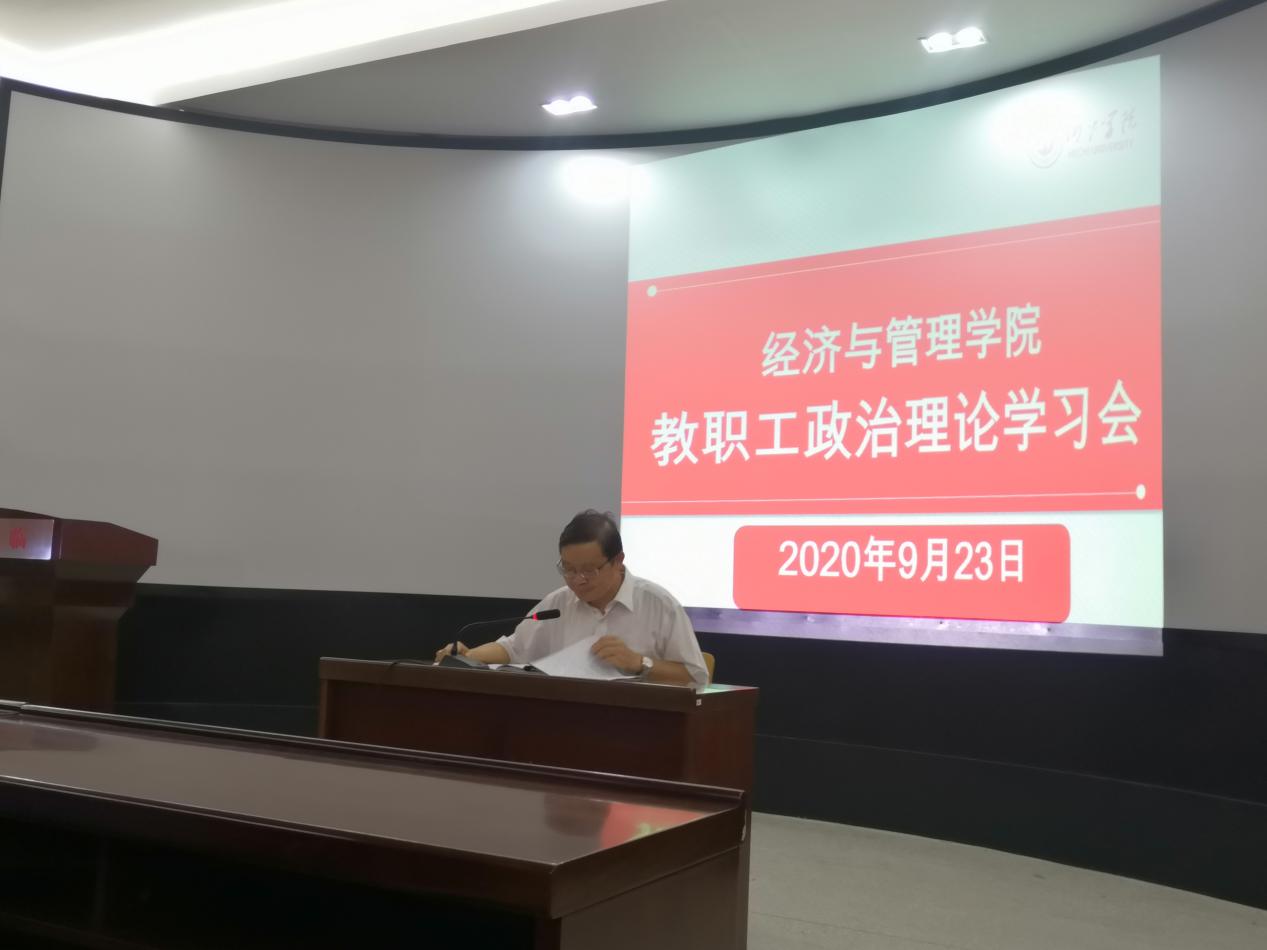 2020年9月23日下午,经济与管理公司在东区弘毅楼3-504教室召开教职工政治理论学习会。公司全体教职工参加此次会议。会议由公司党委书记韦书觉主持。