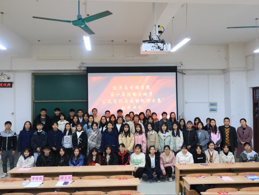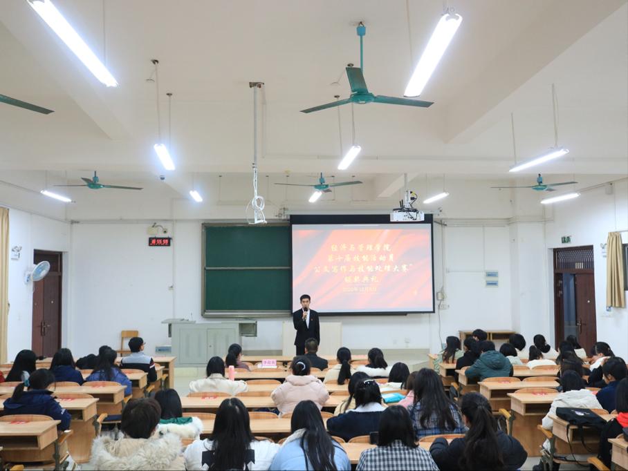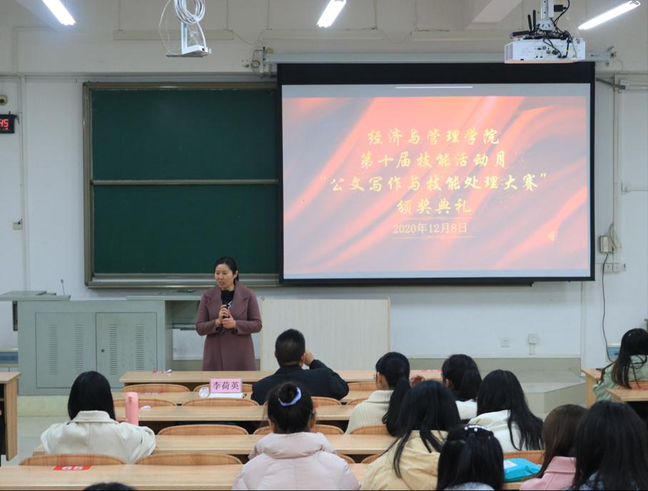 12月8日晚,经管公司于弘毅楼2-205举行第十届技能活动月“公文写作与技能处理大赛”颁奖典礼。公司副经理谭玉龙、公共管理系副主任李荷英为本次颁奖典礼受邀嘉宾。