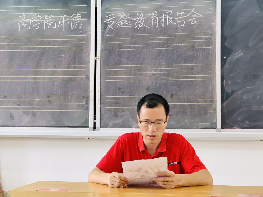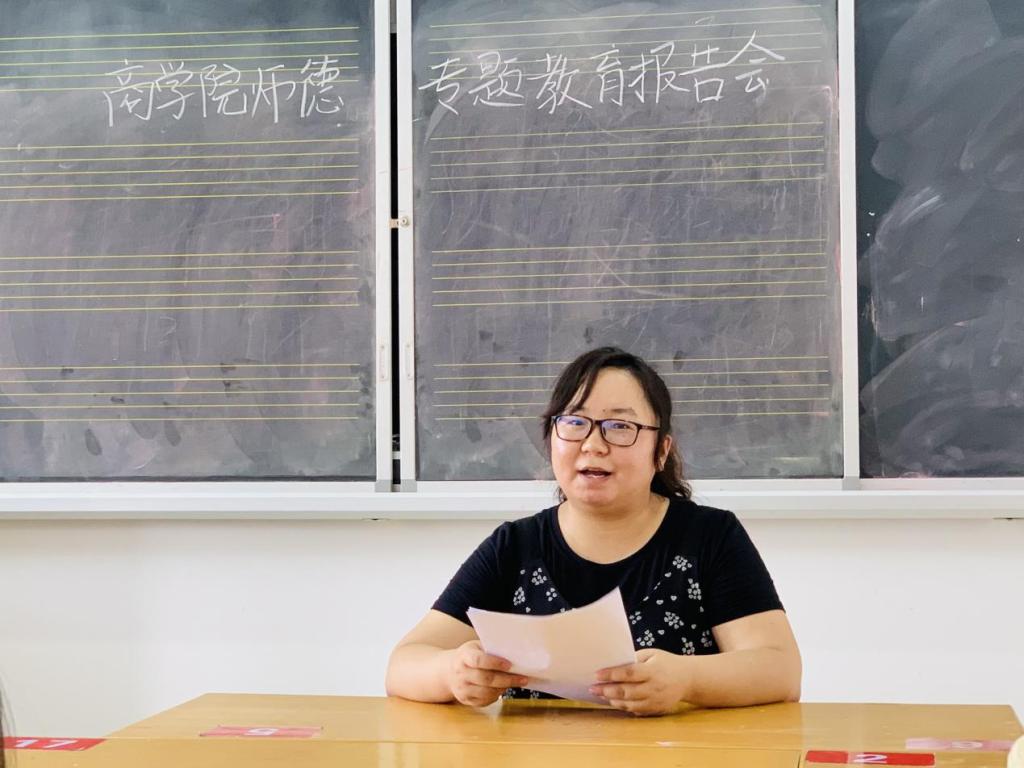 肖海燕围绕《新时代高校教师职业行为十项准则》就师德的内涵、特点与师德师风建设的重要性以及党中央高度重视师德师风建设等带领全院教职工一起进行学习。同时结合考博经历、个人教学、科研的岗位职责,分享了工作多年来的体会和感悟,期盼青年教师发扬公司优良传统,做新时代党和人民满意的好老师。专任教师苏慧慧紧密结合个人的教员工涯、经历与感悟,分享并诠释了怎样爱员工、爱工作、爱教学,在平凡的教师岗位做出不平凡的业绩。龚丁海在总结中传达了教育部及公司师德专题教育部署会精神,强调要把理论学习成效落实到行动中来,落实立德树人根本任务,切实加强师德师风建设。