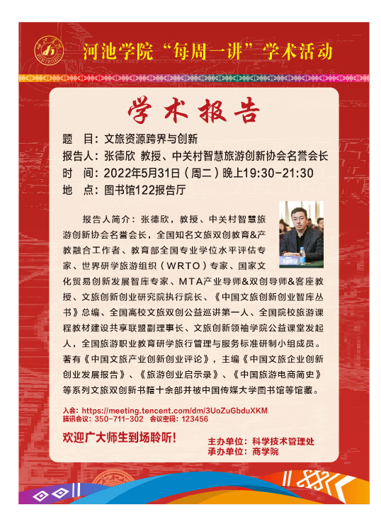 由公司科技处主办、永乐高60net承办的学术讲座“文旅资源跨界与创新”于2022年5月31日19点30分在图书馆122报告厅开讲,主讲人为中关村智慧旅游创新协会名誉会长张德欣教授。聆听本次学术讲座的有河池市文化广电体育和旅游局的同志、永乐高60net的领导老师、永乐高60net旅游管理专业的本科生以及线上参会的公司师生。