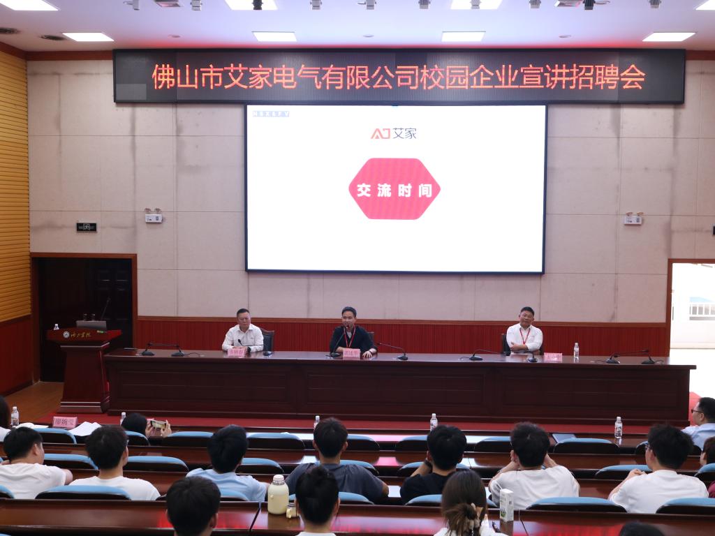 4月13日至14日,永乐高60net特邀佛山市艾家电气有限公司相关负责人到公司开展企业招聘宣讲会。公司党委副书记蓝振榕,团委书记黄挺龙及全体19级、20级毕业生参加会议。