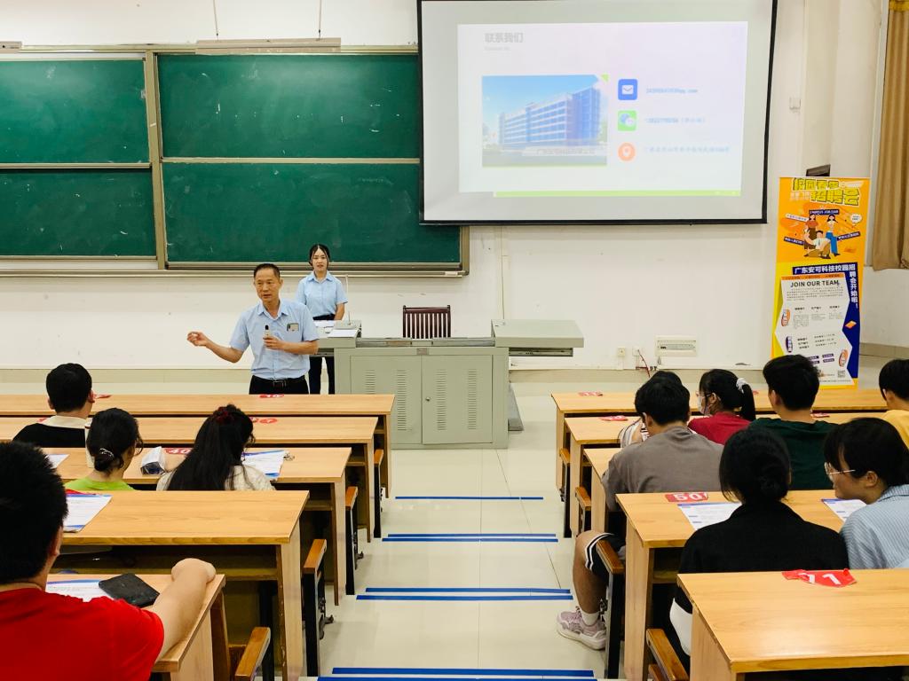 签约仪式结束后,安可科技负责人于弘毅楼1-101为同学们开展了招聘宣讲会,公司辅导员王忠文及19级、20级在校毕业生参加会议。会上,王立健介绍了公司的市场情况、招聘理念、发展前景等,并与同学们探讨了行业未来发展方向,职业晋升潜力等。