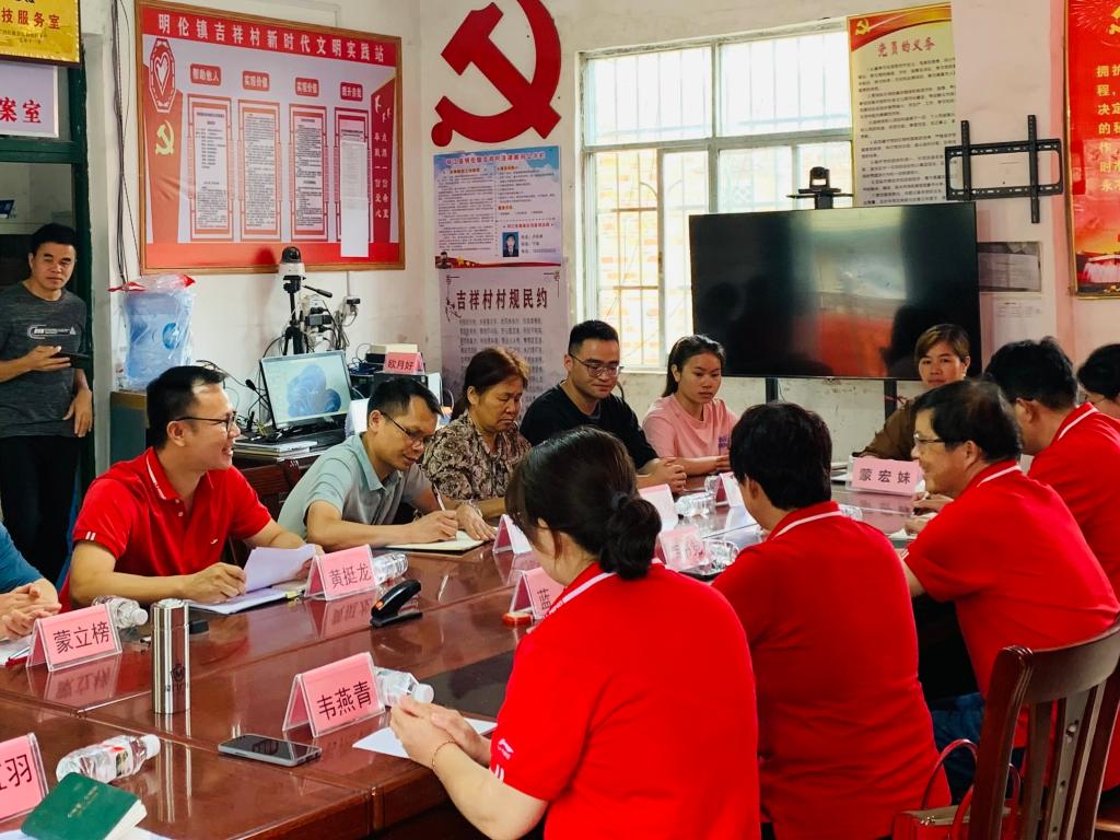 团队随后深入环江县明伦镇吉祥村,以“理论+实践”的模式紧紧围绕学习贯彻习近平新时代中国特色社会主义思想主题教育、“支农助农”志愿服务、金融知识走村入户、“农文旅”引动乡村振兴等方面,通过座谈交流、宣讲红色故事、走访考察等途径与公司驻吉祥村第一书记黄挺龙,吉祥村村委干部、村民进行全面的调研和交流。
