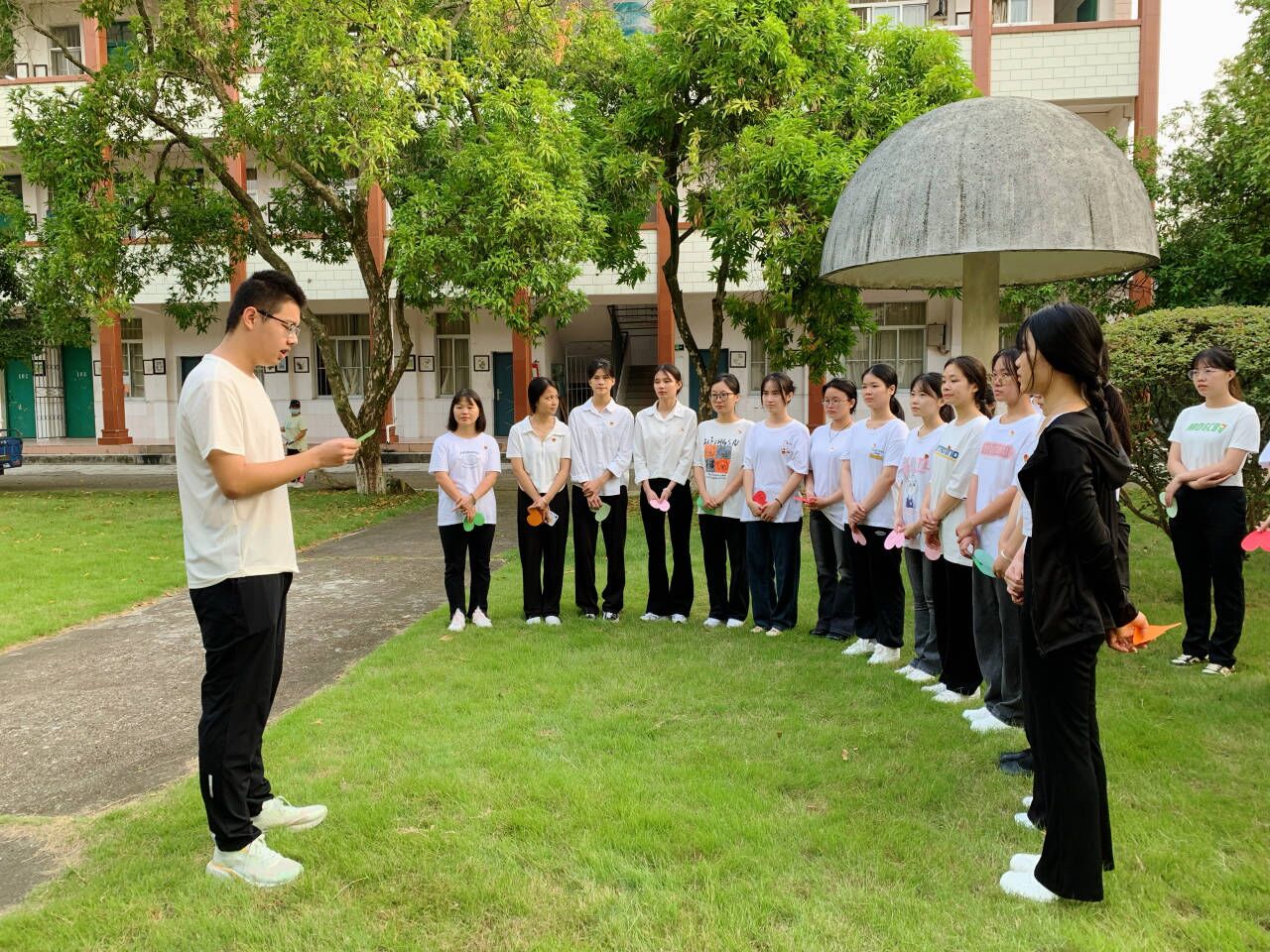 党员同志在逸夫楼广场参加升国旗仪式,并以手写形式向祖国真情告白,为祖国献上最美好的祝愿。韦虹羽在总结中勉励大家要在青春的赛道上奋力奔跑,争取跑出当代青年的最好成绩。